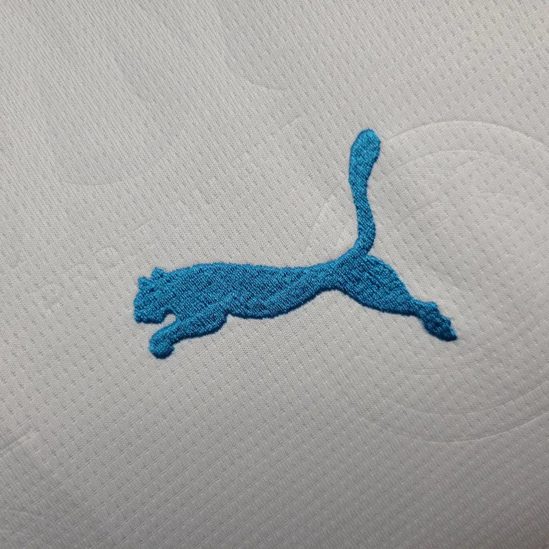 Domowa koszulka Olympique Marsylia na sezon 2025. Biała baza z błękitnymi wykończeniami i charakterystycznym logo Puma. Czysty i nowoczesny styl w barwach klubu