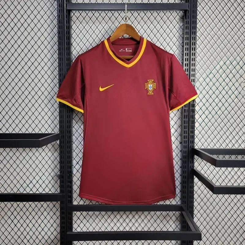 Klasyczna domowa koszulka Portugalii z roku 2000 w bordowej kolorystyce z żółtymi detalami. Kultowy, minimalistyczny design przypomina złote lata portugalskiego futbolu. Idealna propozycja dla fanów retro oraz kolekcjonerów.