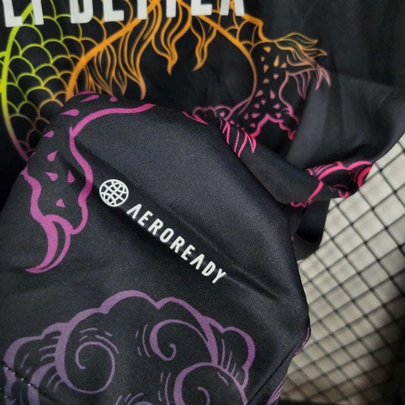 Ta wyjątkowa koszulka Realu Madryt na rok 2024 wyróżnia się efektownym, czarnym tłem oraz kolorowym motywem smoka, symbolizującym siłę i dumę klubu. Wykonana z najwyższej jakości materiałów, zapewnia komfort noszenia i doskonałą wentylację. Idealna dla kolekcjonerów oraz prawdziwych fanów „Królewskich”.
