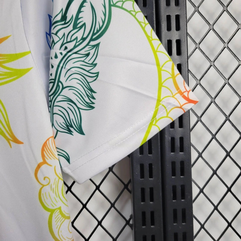 Biała wersja limitowanej koszulki Realu Madryt 2024 zachwyca elegancją i artystycznym wzorem smoka w kolorach tęczy. Połączenie klasyki i nowoczesności sprawia, że to nie tylko odzież sportowa, ale również wyjątkowy element kolekcjonerski.