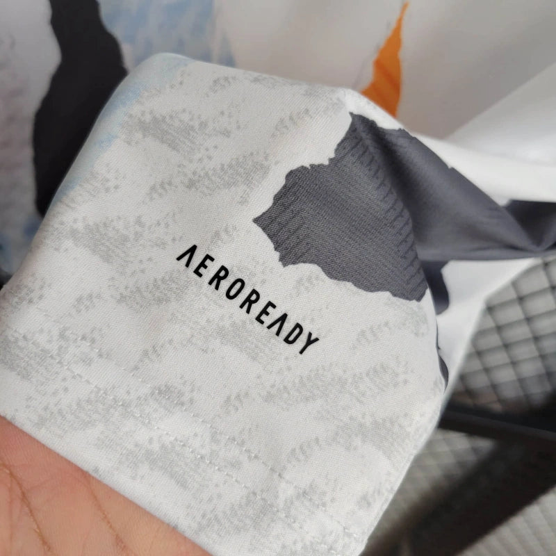 Nowoczesny, energetyczny wzór w odcieniach pomarańczowego, błękitu i szarości nadaje tej koszulce wyjątkowy charakter. Lekka, oddychająca i stworzona z myślą o intensywnych treningach — dla prawdziwych fanów Królewskich.