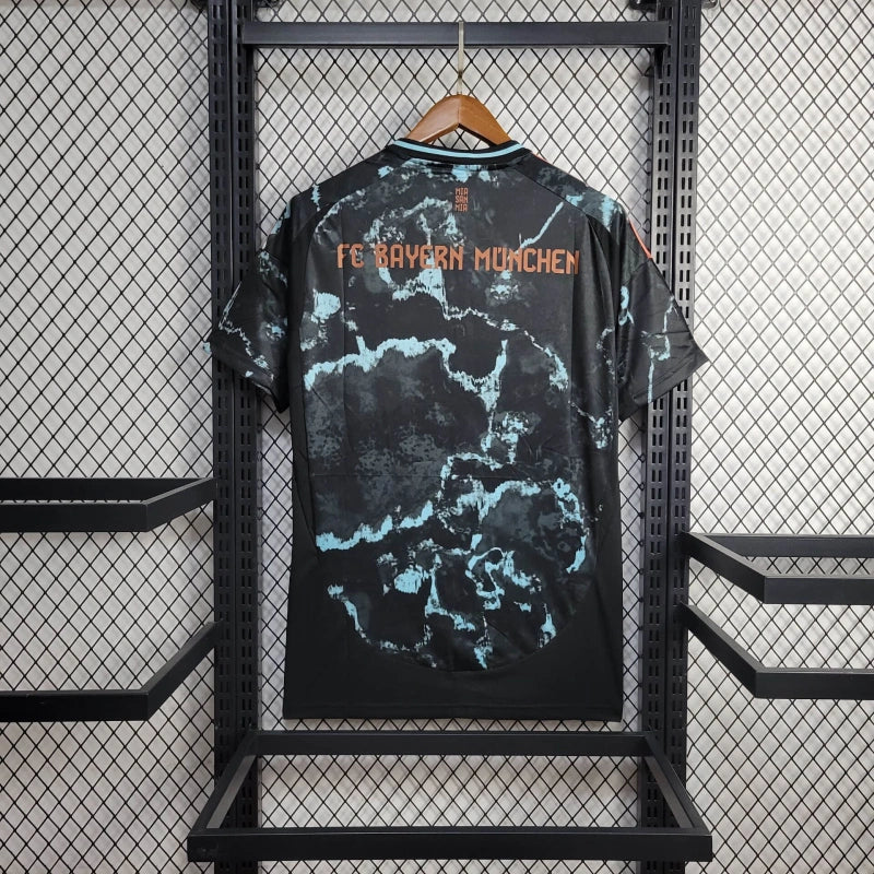 Trzecia koszulka Bayernu Monachium na sezon 2024 to połączenie czerni z efektownym, marmurkowym wzorem w odcieniach błękitu. Akcenty w kolorze miedzianym dodają elegancji, a nowoczesny design adidas doskonale oddaje ducha bawarskiego giganta. Idealna dla fanów ceniących wyjątkowy styl i jakość.