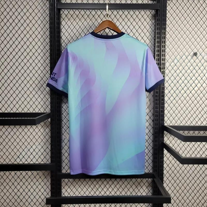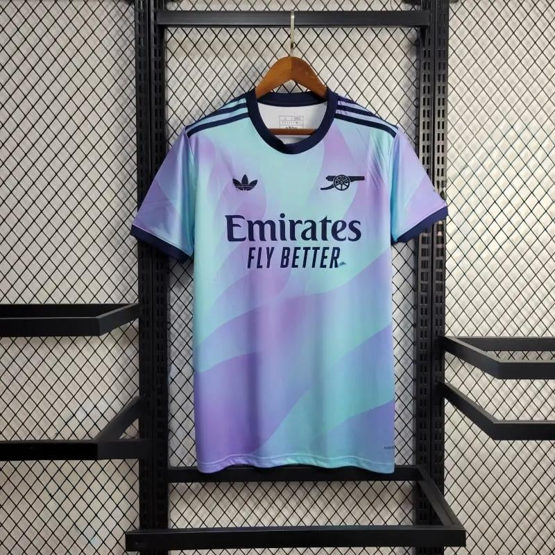 Wyjazdowa koszulka Arsenalu na sezon 2024 to połączenie nowoczesności i stylu – delikatne przejścia kolorów fioletu, błękitu i turkusu tworzą wyjątkowy efekt wizualny. Projekt adidas Originals łączy elegancję z odważnym designem, symbolizując kreatywność „Kanonierów”.