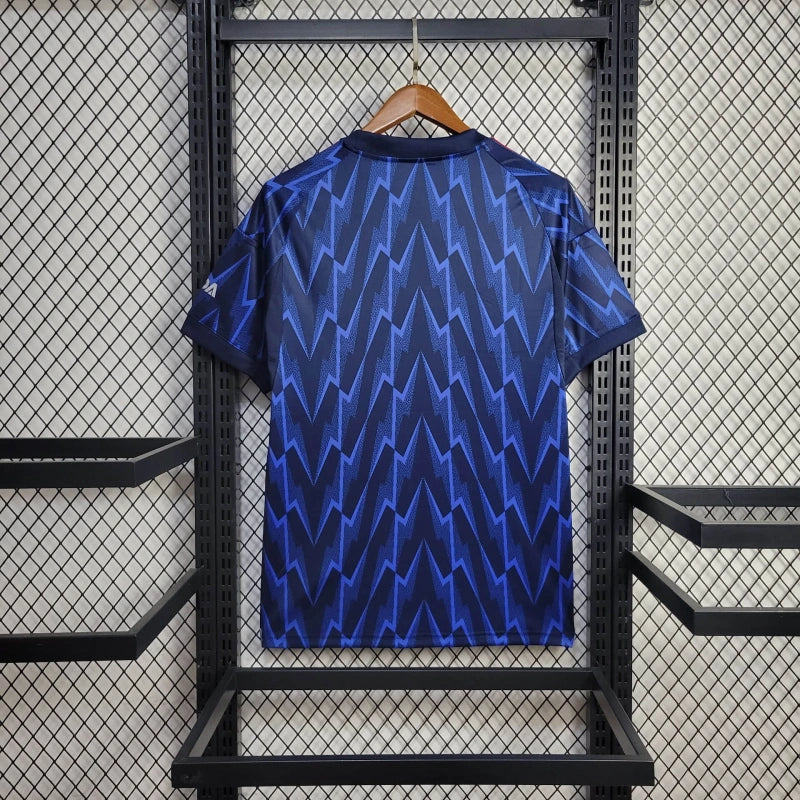 Wyjazdowa koszulka Arsenalu na sezon 2025. Granatowy wzór z błyskawicami i czerwonymi akcentami na ramionach. Dynamiczny design, który oddaje energię Kanonierów.