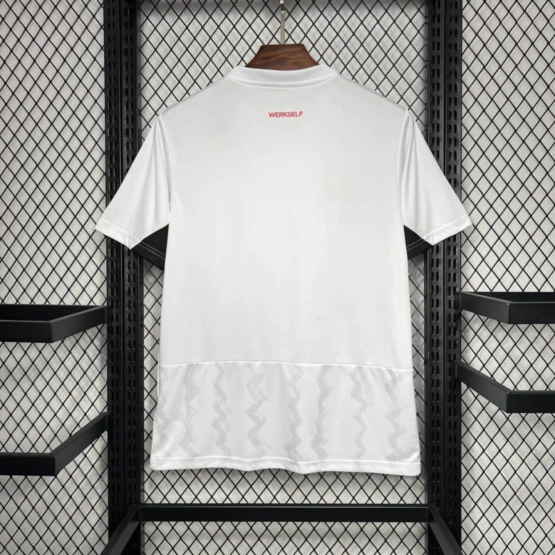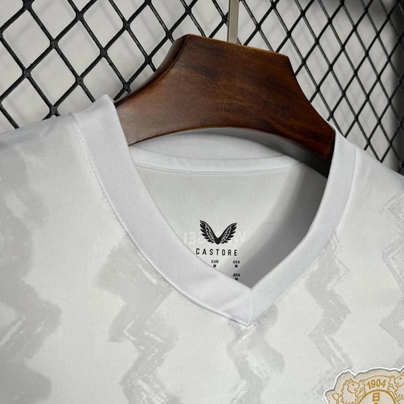 Elegancka biała koszulka wyjazdowa Bayer Leverkusen 2024 to połączenie klasy i sportowego stylu. Złote logo Castore oraz delikatny, geometryczny wzór nadają jej wyjątkowego wyglądu. Lekka tkanina zapewnia doskonałą wentylację i komfort.