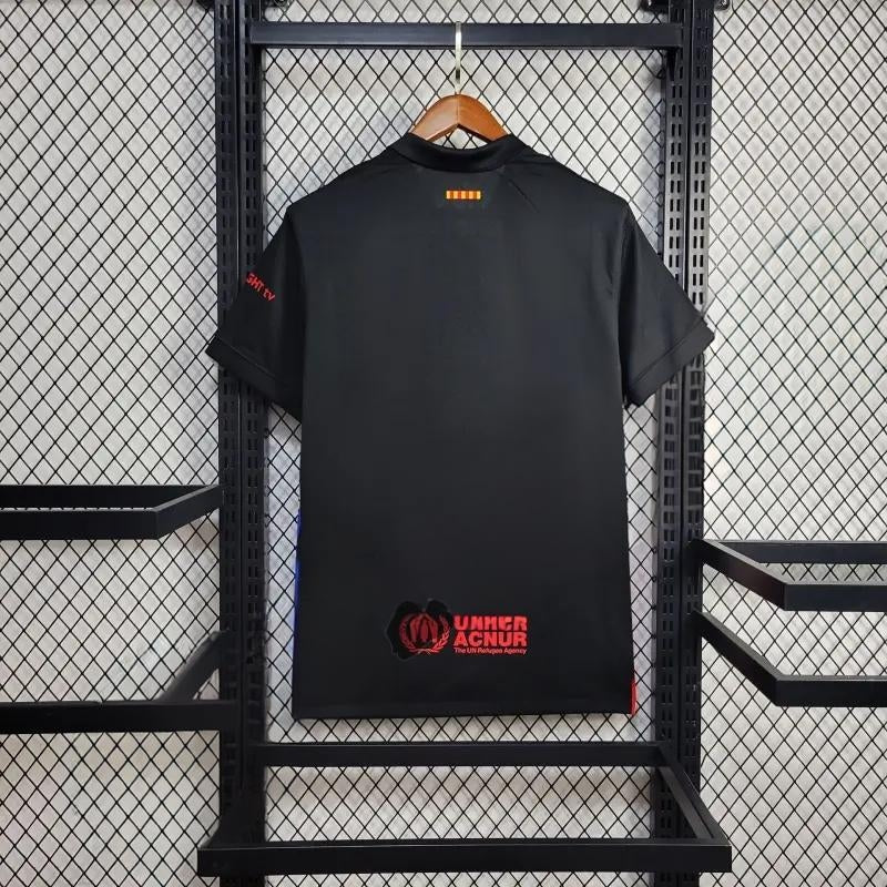 Stylowa, czarna koszulka wyjazdowa FC Barcelony na sezon 2024 emanuje elegancją i siłą. Z minimalistycznym designem, czerwonym logotypem Spotify i subtelnymi niebiesko-czerwonymi detalami, symbolizuje nowoczesne oblicze Dumy Katalonii. Wykonana przez Nike z najwyższej klasy materiałów technicznych.