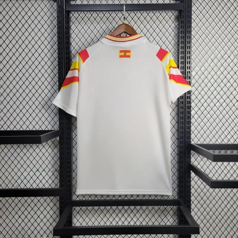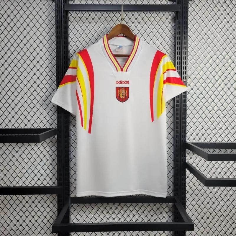 Klasyczna koszulka reprezentacji Hiszpanii z połowy lat 90., wyróżniająca się dynamicznymi czerwono-żółtymi akcentami. Lekka, wygodna i idealna dla fanów retro stylu oraz kultowych europejskich turniejów.