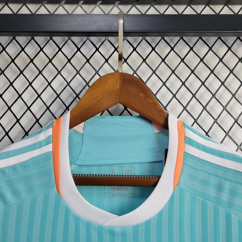 Wyjazdowa koszulka Inter Miami na sezon 2024 w pastelowym turkusie z pomarańczowymi detalami to kwintesencja stylu i luzu południowej Florydy. Wykonana przez adidas, łączy elegancki wygląd z doskonałą funkcjonalnością. Idealna dla fanów drużyny, w której grają największe gwiazdy światowego futbolu.