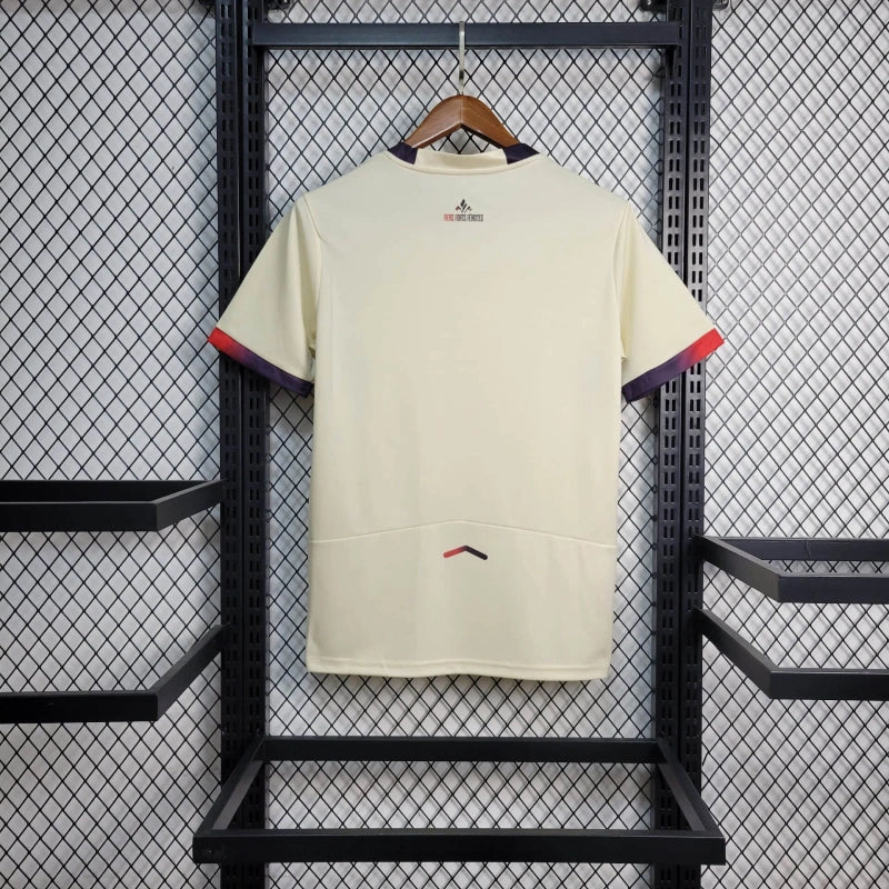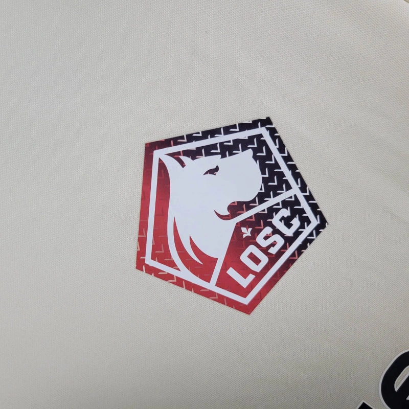 Oficjalna koszulka wyjazdowa Lille OSC na sezon 2025. Utrzymana w eleganckim kremowym kolorze z granatowo-czerwonymi wykończeniami na rękawach. Klasyczny styl francuskiego klubu połączony z nowoczesnym krojem i logotypem sponsora w centralnej części.
