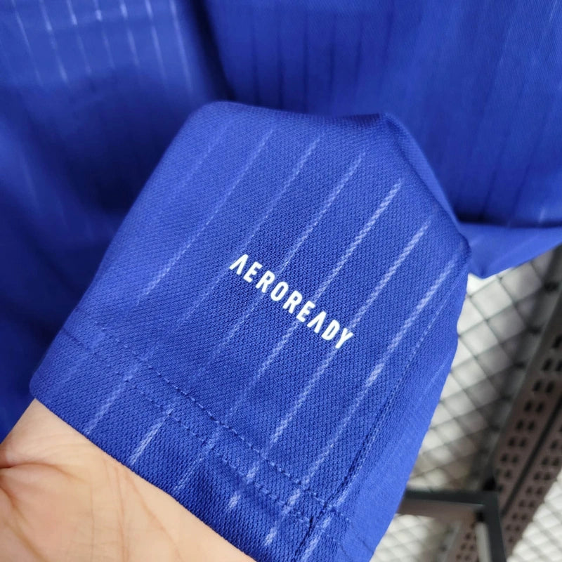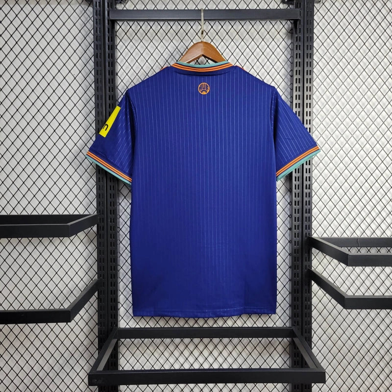 Fioletowo-granatowa koszulka z pomarańczowymi elementami i logo sponsora Sela. Styl retro z trzema paskami Adidasa.