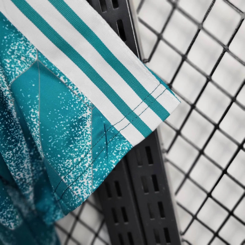 Ikoniczna koszulka reprezentacji Niemiec z 1990 roku od Adidasa w kolorze turkusowym z geometrycznym wzorem w stylu retro. Ten model to symbol złotej ery niemieckiego futbolu, zakończonej triumfem na Mistrzostwach Świata we Włoszech.