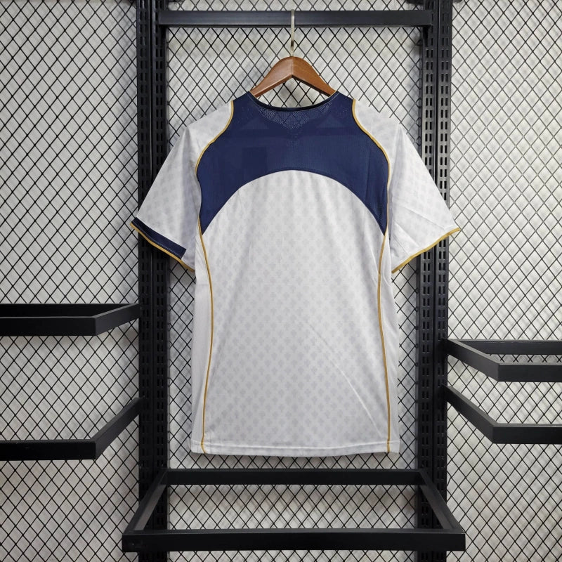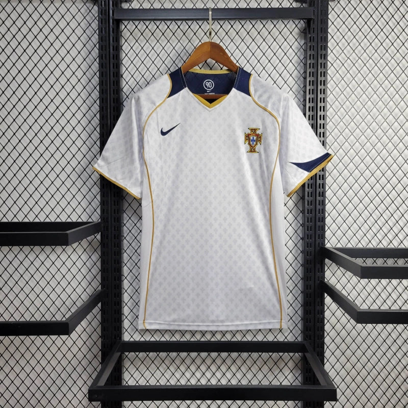 Koszulka Portugalii z Euro 2004 to elegancka, biała konstrukcja z subtelnym wzorem i złotymi detalami. Projekt Nike łączy sportowy charakter z finezją, a jej design nawiązuje do ery, w której na boisku błyszczał młody Cristiano Ronaldo. To pozycja obowiązkowa dla fanów reprezentacji.