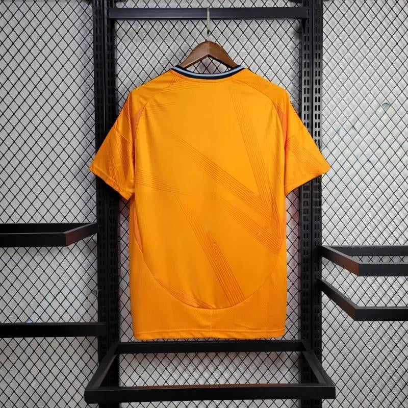 Wyjazdowa koszulka Realu Madryt na sezon 2024 w odcieniu intensywnego pomarańczu to śmiała i energetyczna interpretacja klasyki. Charakterystyczne czarne detale, w tym trzy paski adidasa i herb „Królewskich”, tworzą kontrastowy, ale elegancki wygląd, który idealnie oddaje styl i ambicję klubu.
