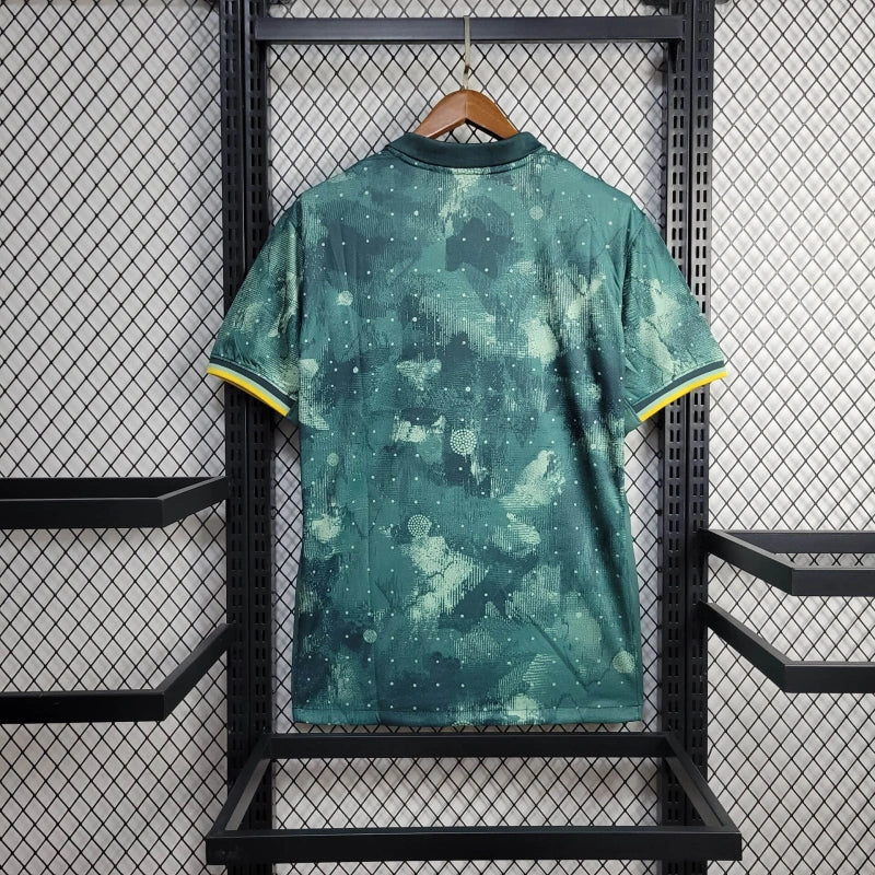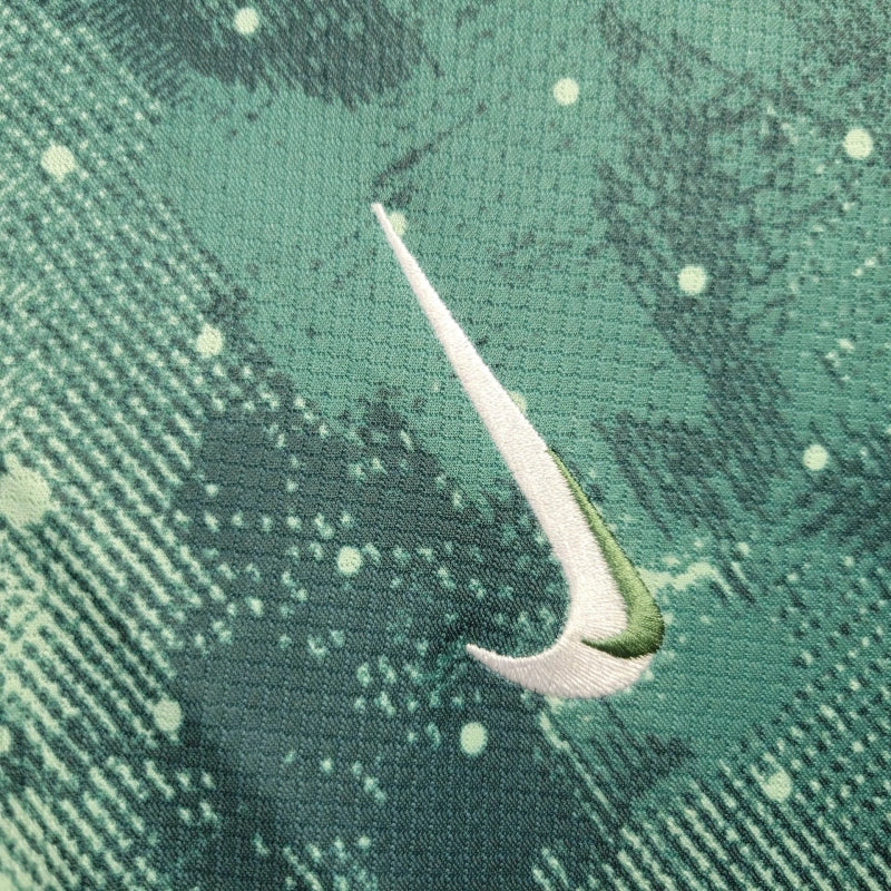 Wyjazdowa koszulka Tottenhamu na sezon 2024 to oryginalny, artystyczny projekt w odcieniach zieleni i granatu, z nieregularnym wzorem przypominającym galaktyczny motyw. Nike stworzyło unikalny design, który odzwierciedla nowoczesność i kreatywność londyńskiego klubu.